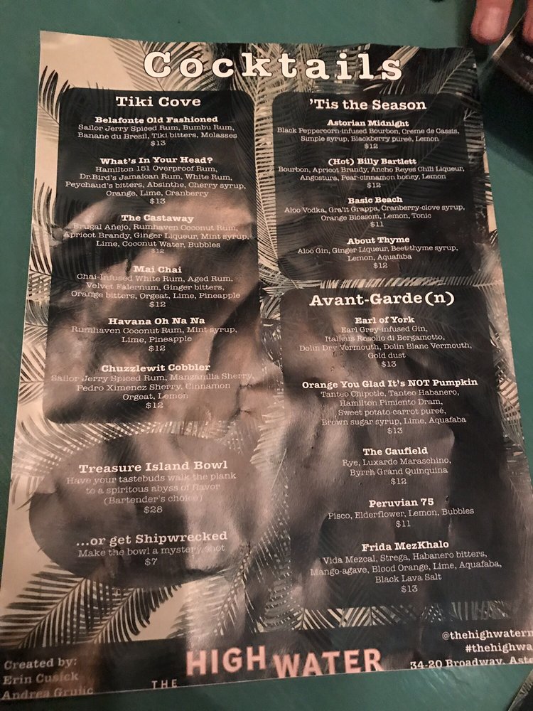 The Highwater offers a diverse menu with a mix of hot appetizers like edamame and gyoza, as well as cold appetizers such as poke tuna and salmon cappacio. The specials, like the Monkey Brain Avocado Salad Ball and Spicy Tuna on Crispy Rice, showcase unique and delicious fusion flavors. Customers praise the bottomless boozy brunch and friendly service. The outdoor seating and happy hour specials add to the overall experience. The drinks are well-balanced, with standout cocktails like the monkey do monkey see and French 75. The vibe is trendy and casual, perfect for brunch or a night out. Overall, The Highwater is a hidden gem in Astoria, offering a great dining experience with tasty food and innovative drinks.